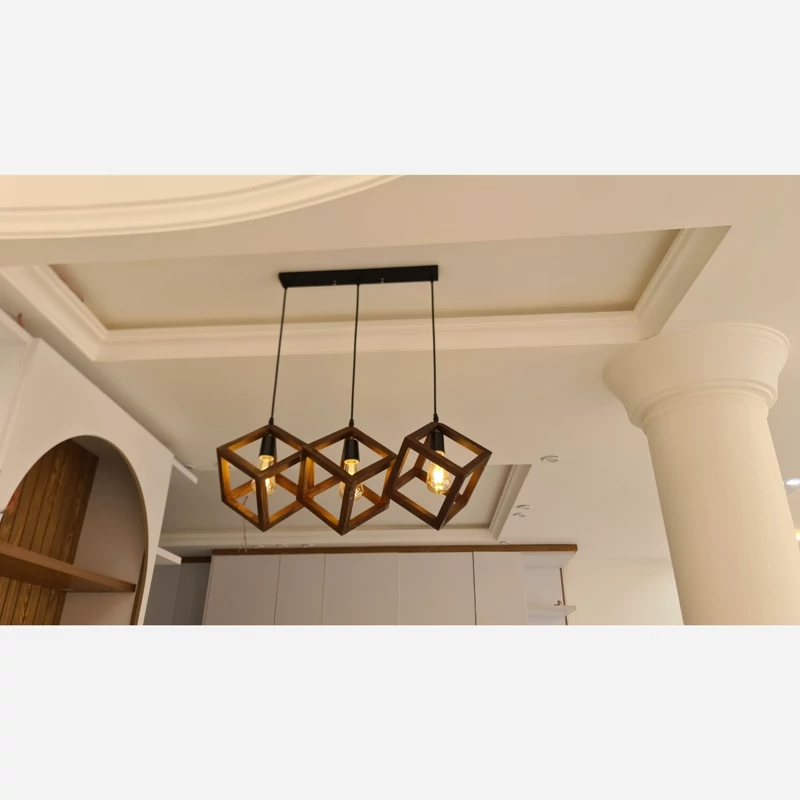 لوستر سه شعله مکعب از جنس چوب کاملا قابل شست و شو لامپ معمولی میخوره و هر نوع لامپی داشته باشین روش نصب میشه به صورت سینی خطی و گرد موجود هست خطی برای روی اپن و میز ناهار خوری و راهرو گرد برای وسط آشپزخانه و اتاق خواب و راهرو